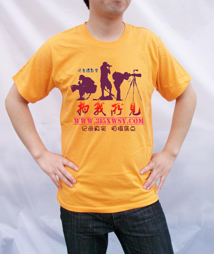 出售印有"315記者攝影家"圖文的短袖圓領(lǐng)速干t恤文化衫和天絲棉翻領(lǐng)短袖衫,兩件包郵(圓領(lǐng)速干t恤每件45元; 天絲棉翻領(lǐng)短袖衫每件60元).