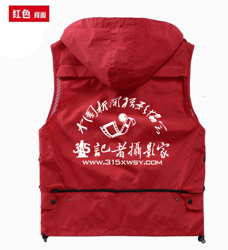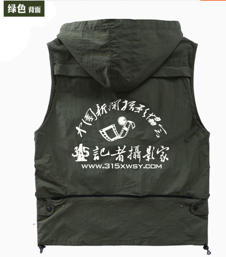 315記者攝影家訂制的,攝影馬甲LOGO印制速干多口袋戶外春秋夏季透氣面料塔絲隆馬甲,每件130元(熱轉(zhuǎn)印圖文,十件以上繡字).
