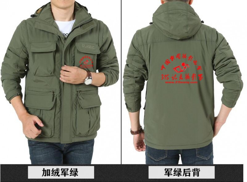 分為卡其色和軍綠色,春秋薄款背部加印“315記者攝影家網(wǎng)”標(biāo)志,合每件195元,加絨款背部加印“315記者攝影家網(wǎng)”標(biāo)志合每件235元。