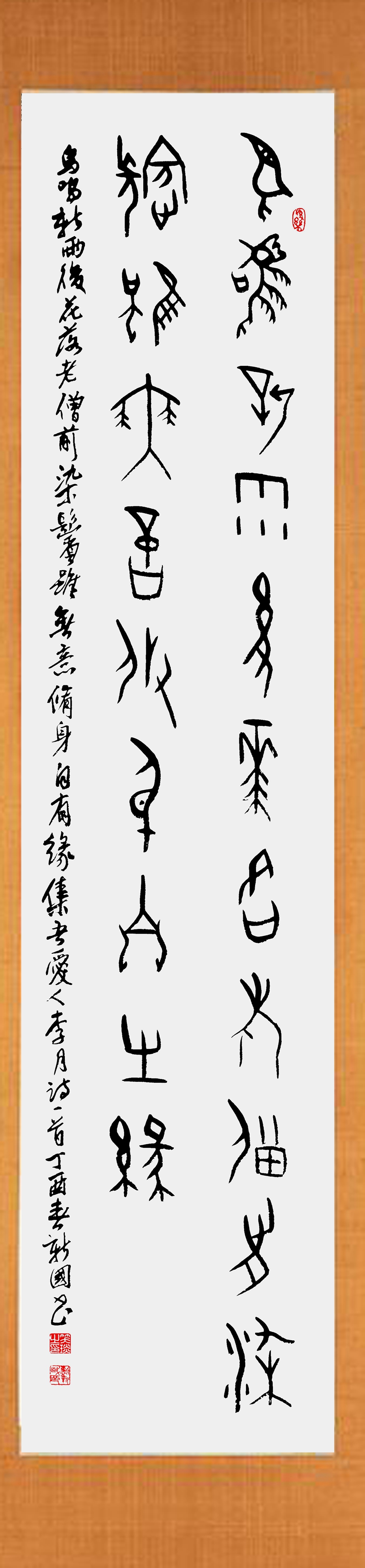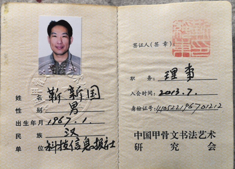 《作家報?藝術(shù)世界》主編、書法家楊紹穆先生曾在新國甲骨文個人書法展時賦詩一首:“安陽甲骨欲尋根,雨潤書法不同倫。點畫拙樸能膺古,抱殘守缺布局新。兼師南宮二王法,讀貼著述百家文。”