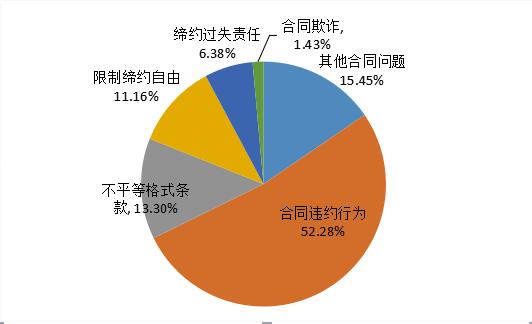 涉及合同問題的投訴主要包括:合同違約行為;不平等格式條款;限制締約自由等,其占合同問題比重分別為52.28%、13.30%和11.16%。