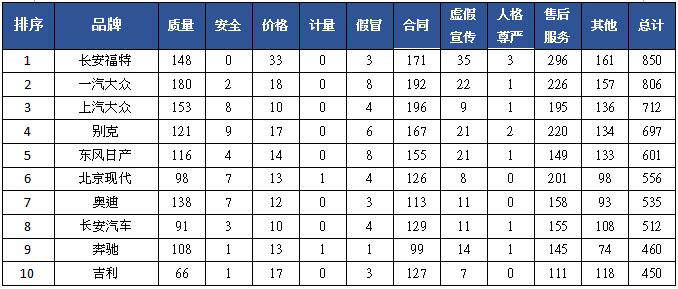 表3 被投訴汽車品牌前十(完整統(tǒng)計見附表)