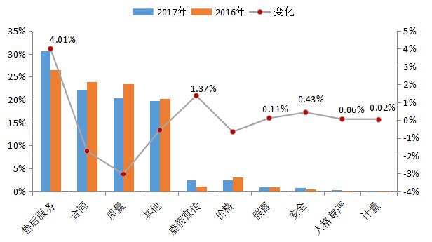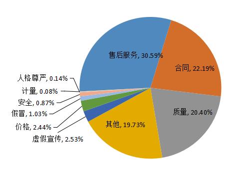 售后服務(wù)、虛假宣傳、假冒、安全、人格尊嚴(yán)、計量問題投訴量較去年同期出現(xiàn)不同程度的增加,其中,售后服務(wù)和虛假宣傳問題投訴量增幅相對較大,分別增加4.01%和1.37個%,消費者消費時應(yīng)重點防范此類問題的發(fā)生。