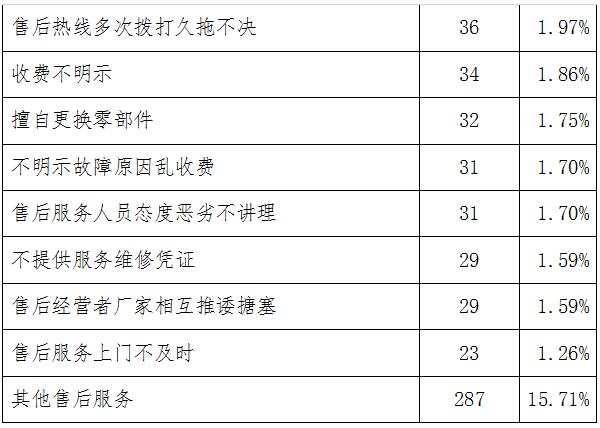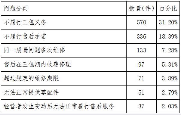 具體看,涉及售后服務(wù)問題的投訴主要包括:不履行三包義務(wù);不履行售后承諾;同一質(zhì)量問題多次維修;售后在三包期內(nèi)收費修理等,其占售后問題比重分別為31.20%、18.39%、7.28%和5.31%。