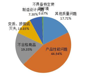 涉及質(zhì)量問題的投訴主要包括:產(chǎn)品性能問題;不合格商品問題;變質(zhì)、損毀或滅失等問題,其占質(zhì)量問題比重分別為44.94%、19.35%、10.03%。
