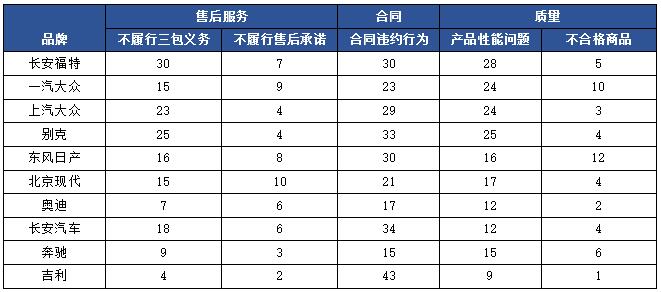 從被訴汽車前十大品牌看,投訴主要問題均以不履行三包義務(wù)、合同違約行為及產(chǎn)品性能三大問題為主,其次是不履行售后承諾和不合格商品問題。