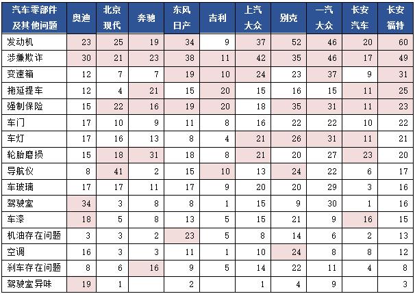 從被投訴的具體問題看,前十品牌被投訴問題主要集中在發(fā)動機故障、涉嫌欺詐、強制保險和變速箱故障問題,其各個品牌主要問題略有差異,其中奧迪汽車的駕駛室問題和駕駛室異味問題嚴(yán)重,投訴量較高;北京現(xiàn)代汽車的導(dǎo)航儀問題突出;奔馳汽車的輪胎磨損等問題投訴量較高等等,其他品牌汽車投訴量較高的部件及問題詳見下表。