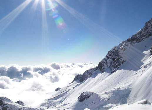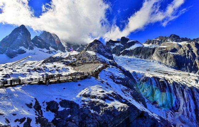 像是一座豎立起來的銀鏵,矗立在麗江壩子的西北角。攀登上白雪山來看它,它像一把白綾折扇展開在那里,所以有扇子陡和雪斗峰的名稱。由錦鄉(xiāng)谷的草坪中仰望上去,它像一片白玉殼,三面作放射狀指向天空,在碧天白云中閃閃發(fā)光。
