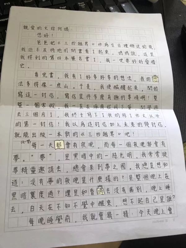 看完書,我有了好多好多的想法,我的想法多得像一座山。於是,我便醞釀起來,開始寫這一封信。寫信是件多麼有趣的事情啊!整整一個寒假,我一直在琢磨從何下筆。開學過去三個月了,我終於寫下了我的除了作文之外的第一封信!我以為這封信加上未來的幾封信,就能出版一本新的《三四越界》吧!
