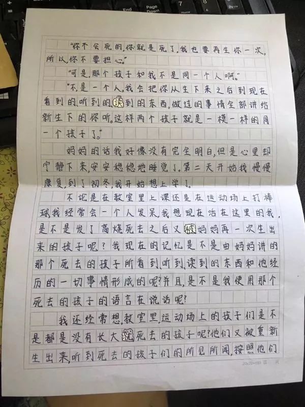 不論是在教室里上課還是在運動場上打棒球,我經(jīng)常會一個人發(fā)呆,我想現(xiàn)在活在這里的我,是不是發(fā)了高燒死去之后又被媽媽再一次生出來的孩子呢?我現(xiàn)在的記憶是不是由媽媽講的那個死去的孩子所看到、聽到、讀到的東西和他經(jīng)歷的一切事情形成的呢?并且,是不是我使用那個死去的孩子的語言在說話呢?