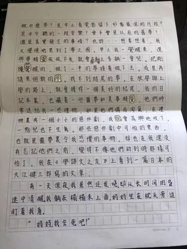 每晚睡覺前,我就會猜一猜,今天晚上會做什麼夢?是早上看電影留下印象最深的片段?是中午聽的一段音樂?會不會是以前的舊夢?還是真實發(fā)生的事情?也許……想著想著,我又慢慢地來到了夢之國。早上我一覺醒來,還與夢精靈依依不捨,就會在床上多躺一會兒,把剛才驚醒的、做了一半的夢接著做下去,或是再請來個新的夢。找不到結尾的夢,在放學與上學的路上,就會獲得一個美好的結尾。我的日記本裏,也藏著一些噩夢和美夢(的)精靈。他們時常送給我一些禮物,如果他們偶爾淘氣,在禮物里加一個小小的惡作劇,我就會高興地收下,一點兒也不生氣。那些惡作劇中可怕的東西,也就是噩夢裏令我恐懼的事物,卻也在我還沒有忘記他們之前,變得不像他們初到時那樣可怕了。我在《學語文之友》上看到一篇日本的大江健三郎寫的文章: