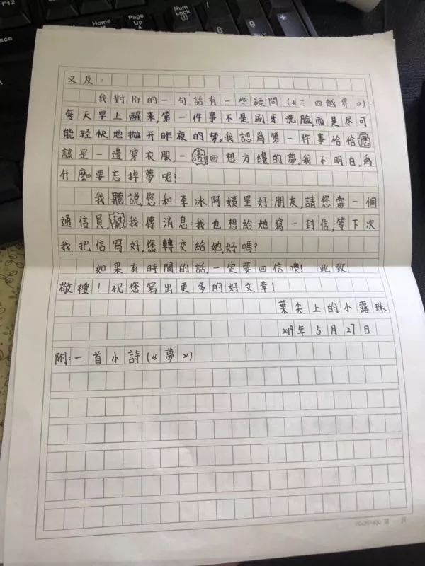 快一個月前,我意想不到地收到了一封來自十二歲女孩漙漙的信。《詩?鄭風》里有“野有蔓草,零露漙兮”,漙,就是露珠又大又圓的樣子。但這位小朋友最后落款謙遜地簽成了“葉尖上的小露珠”,意思當然也是對的。
