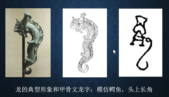 說到龍紋與饕餮紋,在李零看來,龍的原形是鱷魚。中國古代所謂的“鐘鳴鼎食”,中國的禮和禮器多與吃飯有關,而鱷魚什么都吃。他還用一組圖片生動展示了青銅器上各種龍的典型形象,以及“龍”字字型從甲骨文、金文到后世的演化過程。龍頭有角,龍背起脊,龍身有鱗。龍角分棒槌角、羊角、牛角、掌形角,雜糅進不同動物的角,但主體仍是鱷魚。