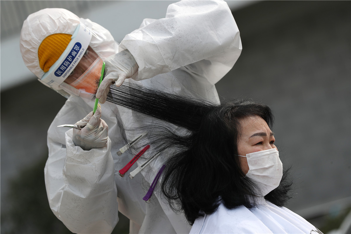 圖為一位理發師為在武漢醫務人員理發。朱興鑫 攝