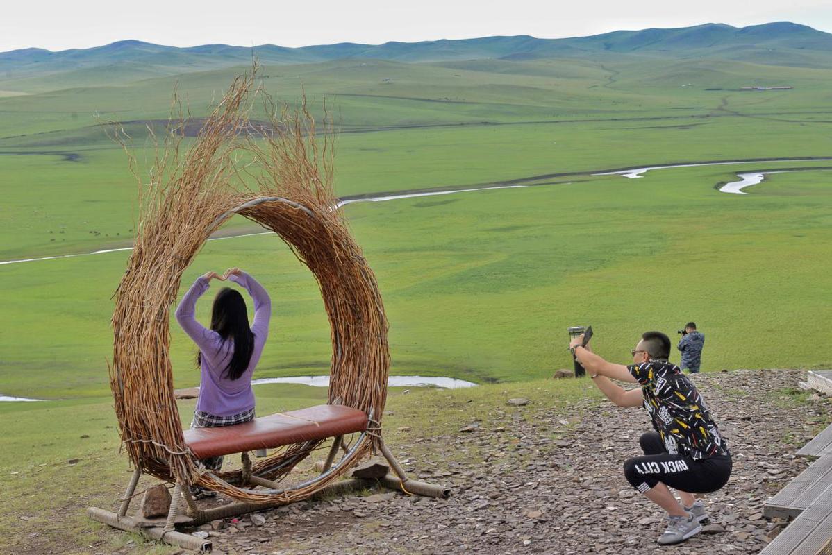 情侶旅行打卡陳巴爾虎旗牧云山頂,擺出愛(ài)心的形狀。
