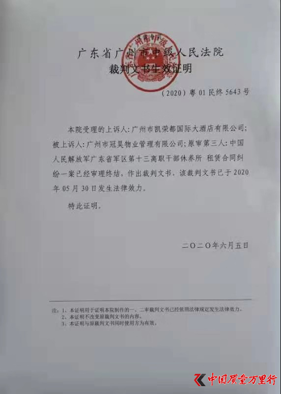 冠昊公司負(fù)責(zé)人稱,2020年5月23日,冠昊公司收到海珠區(qū)新冠肺炎防控領(lǐng)導(dǎo)小組辦公室防治組的《關(guān)于在凱榮都大酒店設(shè)置海珠區(qū)入境人員集中醫(yī)學(xué)觀察場所的函》,稱擬租用該酒店作為海珠區(qū)入境人員集中醫(yī)學(xué)觀察場所。至此,冠昊公司才知悉,本應(yīng)被法院執(zhí)行強(qiáng)制收回的物業(yè),已被凱榮都公司另作他用。