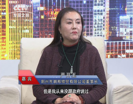 中國(guó)因品牌而驕傲,世界因品牌而自豪,荊州市朋邦物貿(mào)有限公司董事長(zhǎng)嚴(yán)開(kāi)玉女士,泰國(guó)歸國(guó)華僑,泰國(guó)華人青年商會(huì)名譽(yù)會(huì)長(zhǎng),中國(guó)誠(chéng)信企業(yè)家,國(guó)際友好人士。2020年1月1日嚴(yán)開(kāi)玉女士接受中央電視臺(tái)著名主持人阿丘老師的采訪。