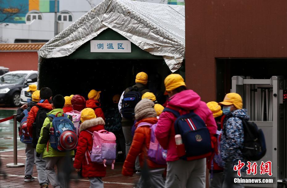 3月1日,北京全市中小學、幼兒園正式開學。恰逢北京迎來明顯雨雪和降溫天氣,家長和學生都穿戴嚴實,迎接開學第一天。圖為豐臺區(qū)師范學校附屬小學的學生正排隊進入測溫區(qū),等待測溫入校。中新社記者 易海菲 攝