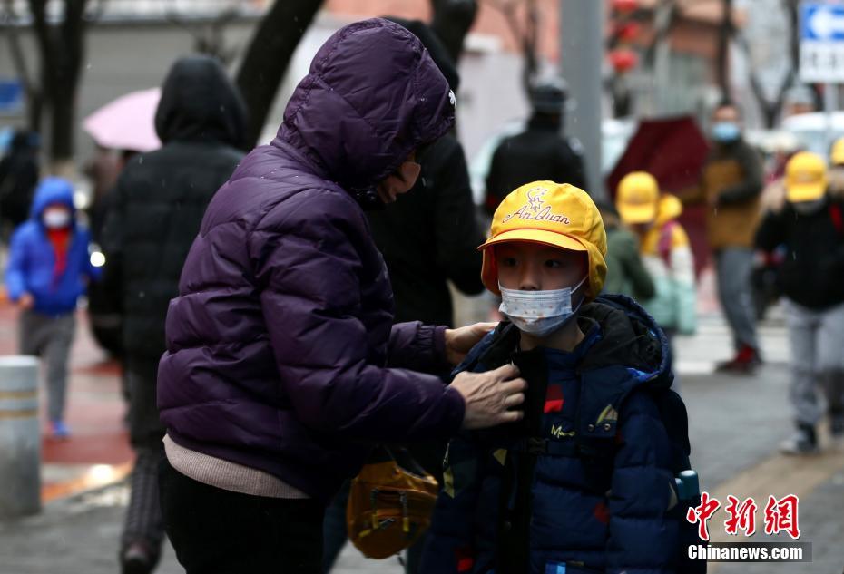 3月1日,北京全市中小學、幼兒園正式開學。恰逢北京迎來明顯雨雪和降溫天氣,家長和學生都穿戴嚴實,迎接開學第一天。圖為豐臺區(qū)師范學校附屬小學的校門前,家長送孩子入校。中新社記者 易海菲 攝