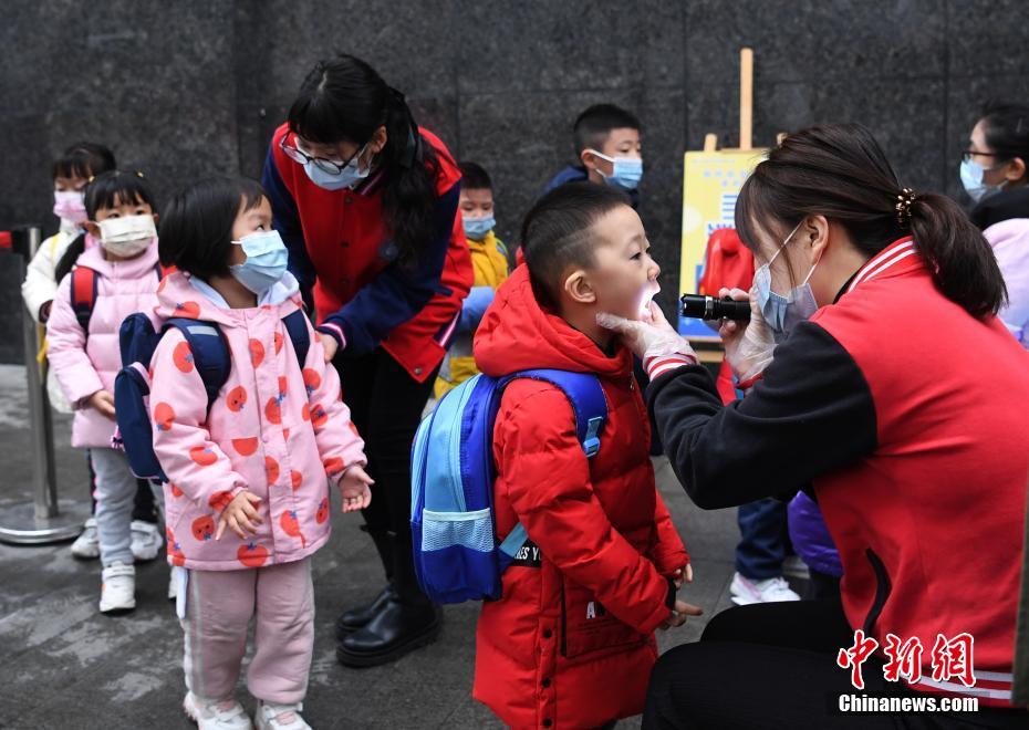 3月1日,重慶市大渡口區(qū)一幼兒園的老師正在為進校學生檢查口腔。當日,在做好疫情防控的前提下,重慶市中小學幼兒園全面開學行課。中新社記者 陳超 攝