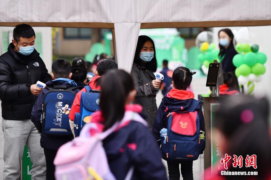 3月1日,成都市華陽中學附屬小學工作人員對入校學生進行體溫測量。當日,成都各中小學迎來開學。中新社記者 張浪 攝