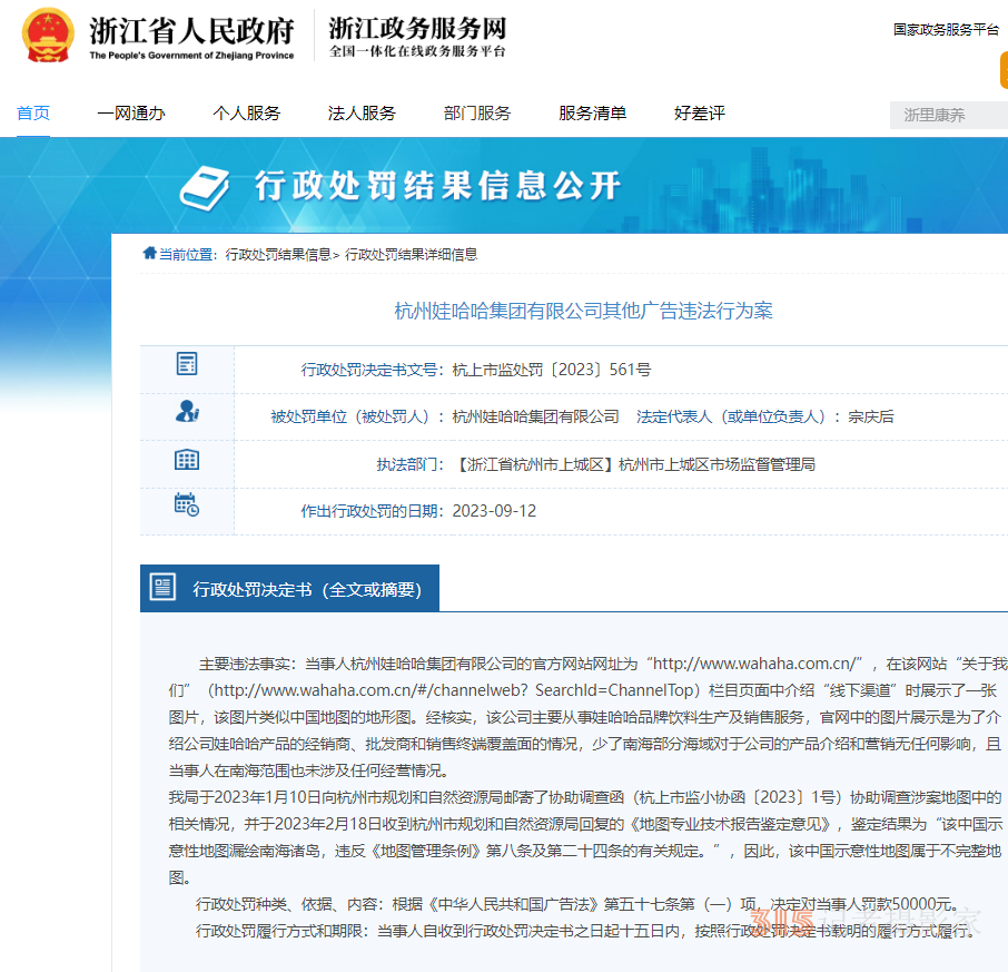 據(jù)浙江省人民政府網(wǎng)站行政處罰信息顯示,當(dāng)事人杭州娃哈哈集團(tuán)有限公司在官網(wǎng)“關(guān)于我們”欄目頁(yè)面中介紹“線下渠道”時(shí)展示了一張圖片,該圖片類(lèi)似中國(guó)地圖的地形圖。經(jīng)杭州市上城區(qū)市場(chǎng)監(jiān)督管理局核實(shí),該公司主要從事娃哈哈品牌飲料生產(chǎn)及銷(xiāo)售服務(wù),官網(wǎng)中的圖片展示是為了介紹公司娃哈哈產(chǎn)品的經(jīng)銷(xiāo)商、批發(fā)商和銷(xiāo)售終端愛(ài)蓋面的情況。