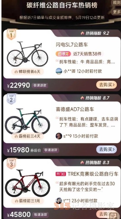 記者觀察到,目前在淘寶平臺,崔克、閃電等品牌正在開展年中促銷活動,多款公路自行車、山地自行車、多功能自行車正在火熱銷售,其中,碳纖維產品銷量領先。“碳纖維相較于鋁合金等剛性高,且更輕量化,消費者買得最多。”閃電銷售人員對記者表示。