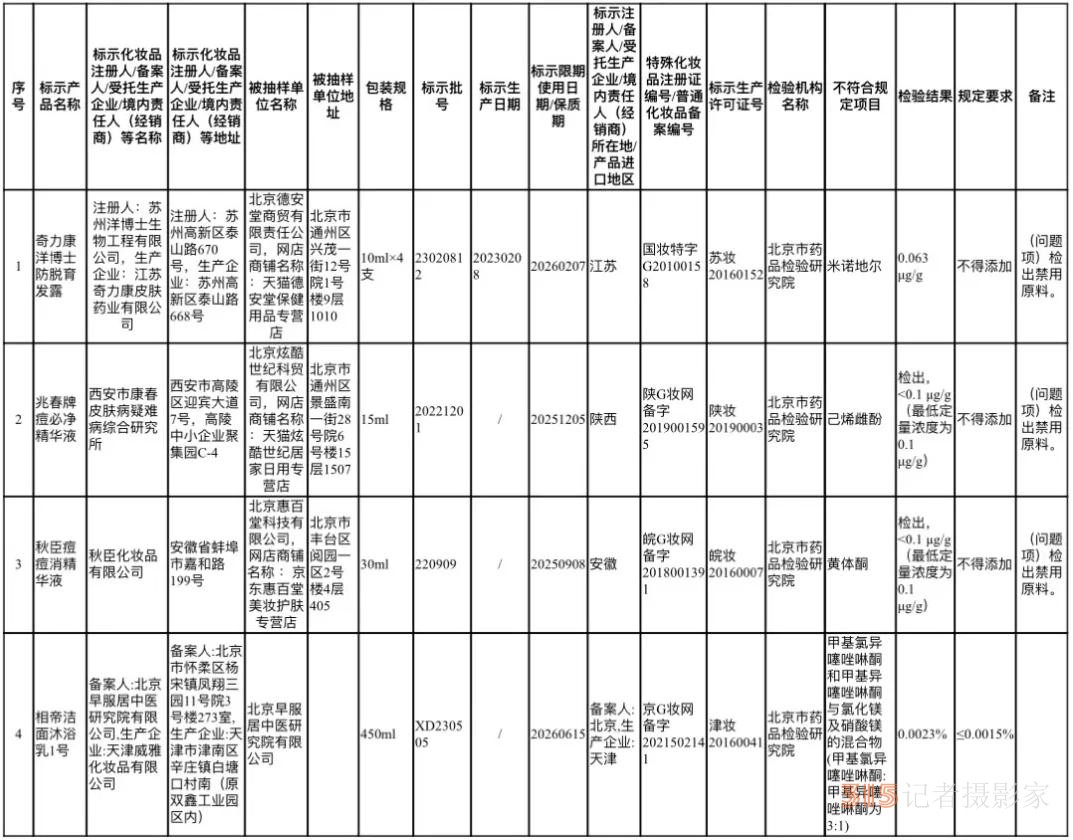 近日,北京市藥品監(jiān)督管理局公布了一則化妝品監(jiān)督抽檢公告,披露4批次不合格產(chǎn)品。其中,奇力康洋博士防脫育發(fā)露、兆春牌痘必凈精華、秋臣痘痘消精華液檢出禁用原料;相帝潔面沐浴乳1號檢出防腐劑超標(biāo)。