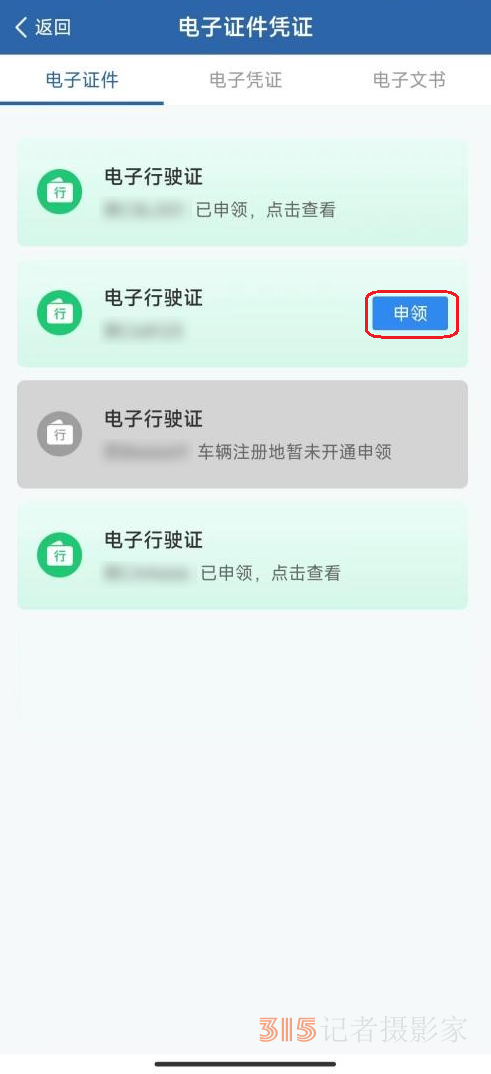 個人用戶登錄“交管12123”APP,點擊首頁“電子證件憑證”功能,進入“電子證件”子功能。用戶名下有機動車的,可點擊電子行駛證右側(cè)的【申領】按鈕進行申領。