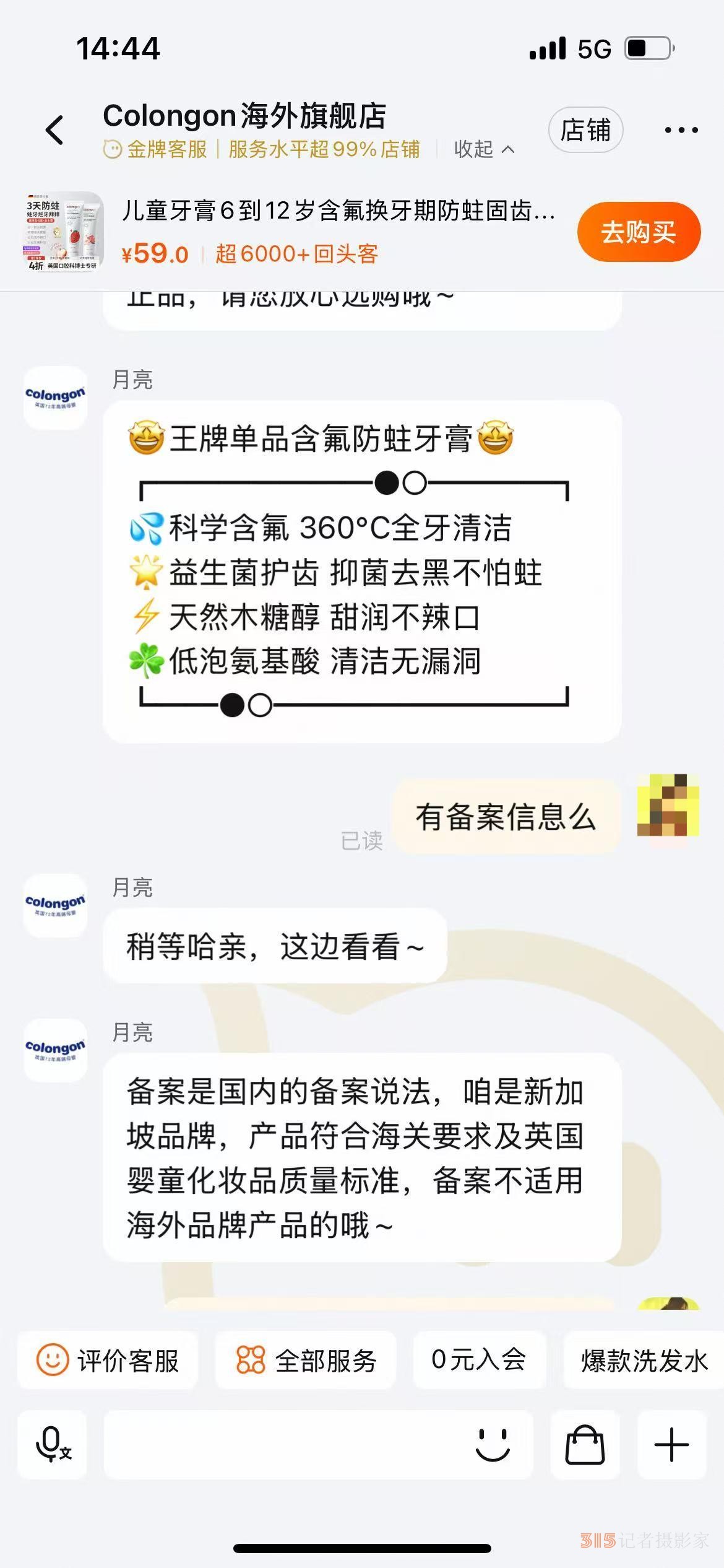 當(dāng)記者詢問colongon店鋪客服該牙膏是否備案時(shí),客服回應(yīng)稱該品牌為“新加坡品牌”、英國嬰童化妝品質(zhì)量標(biāo)準(zhǔn),“備案”是國內(nèi)的說法,不適用于海外品牌產(chǎn)品。