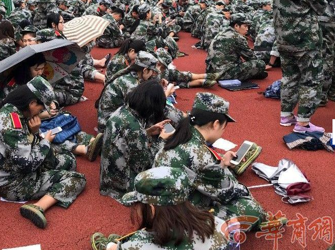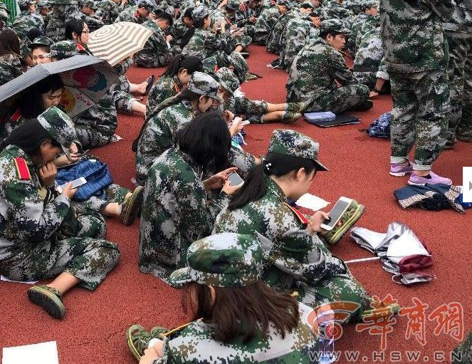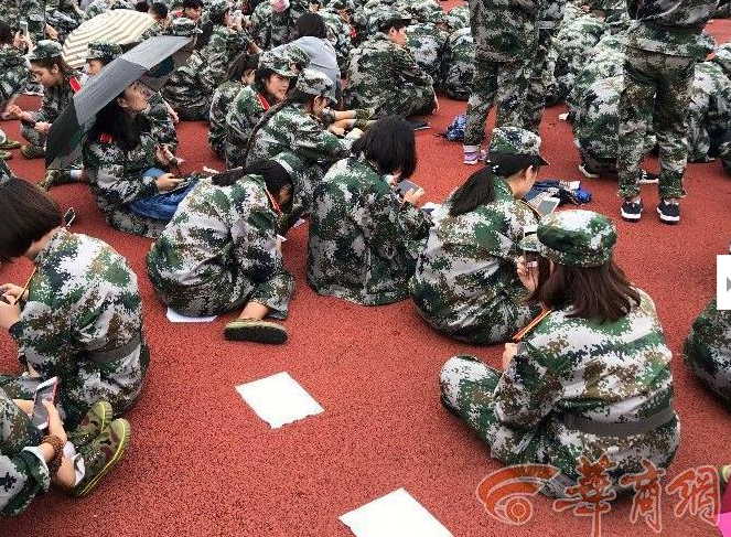 一位參加軍訓的新生告訴記者,他們軍訓已經有10多天了馬上就要結束。記者看到有不少女生在席地而坐時,還不忘墊上一張餐巾紙,有的則撐著雨傘,在傘下玩著手機。一位路過操場的老人說,現在的孩子吃不了苦,家長太過于溺愛。
