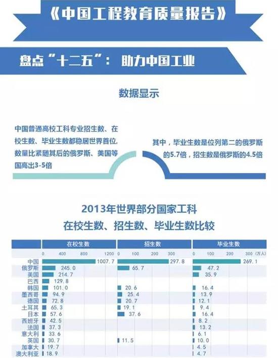 《中國工程教育質(zhì)量報告》指出,“十二五”期間,中國工程教育主動“轉型升級”,變革發(fā)展,建成了層次分明、類型多樣、專業(yè)齊全、區(qū)域匹配的世界最大工程教育供給體系。數(shù)據(jù)顯示,中國普通高校工科專業(yè)招生數(shù)、在校生數(shù)、畢業(yè)生數(shù)穩(wěn)居世界首位,數(shù)量比緊隨其后的俄羅斯、美國等國高出3-5倍。