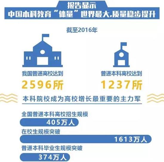 根據(jù)報告,截至2016年,我國普通高校達到2596所,普通本科高校達到1237所,本科院校成為高校增長最重要的主力軍。全國普通本科高校招生規(guī)模405萬,在校生規(guī)模突破1613萬,普通本科畢業(yè)生規(guī)模突破374萬,我國已成為名副其實的高等教育大國。