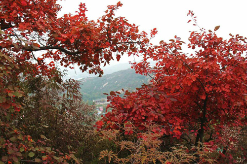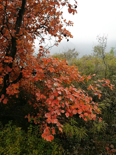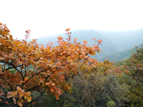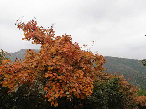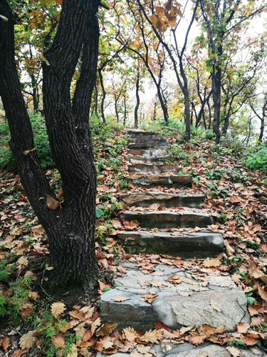 沿著登山步道慢慢向上,一路上植被繁茂,常綠的,黃葉的,紅葉的都有,相映相間,甚是好看,引得大家紛紛拍照。難怪人們常會(huì)感嘆當(dāng)生如夏花之燦爛,死如秋葉之靜美。于是我詠道: 菁華莫怨去匆匆, 裝扮江山第一功。 日影閑描千樣巧, 層林重染萬(wàn)般紅。 常因潑墨頻滋趣, 偶得題詩(shī)更不同。 命理輪回皆有數(shù), 翩躚搖落待金風(fēng)。