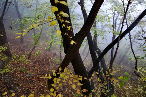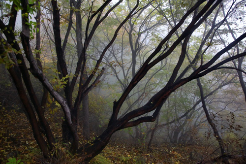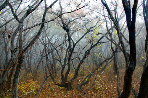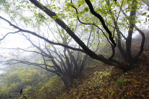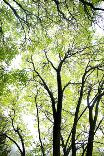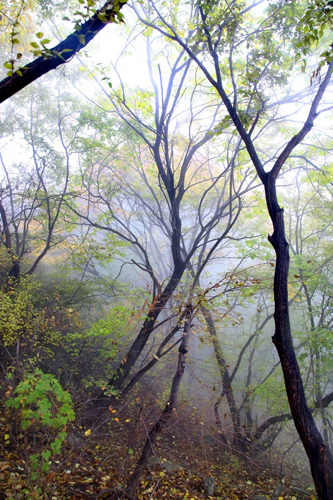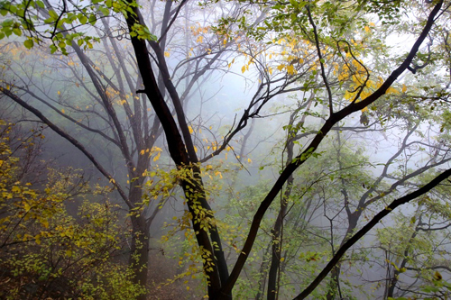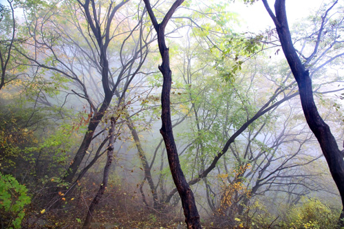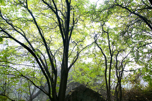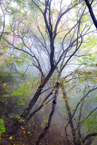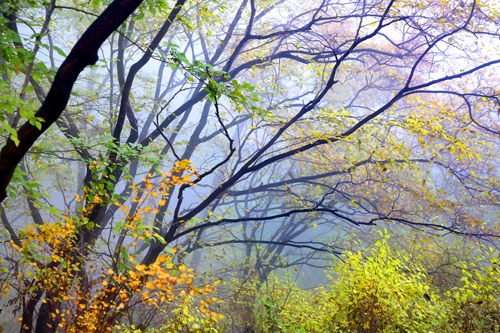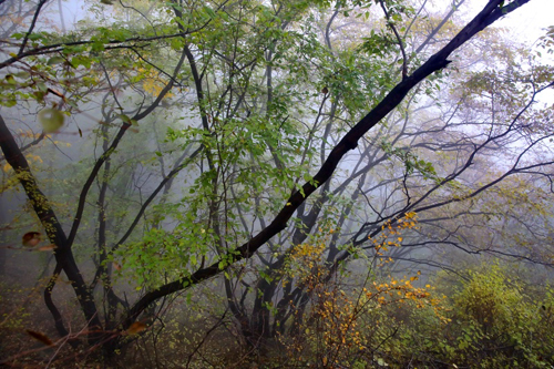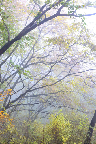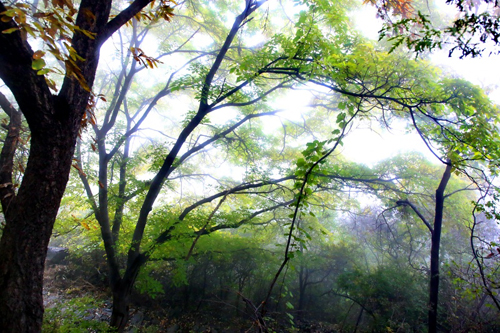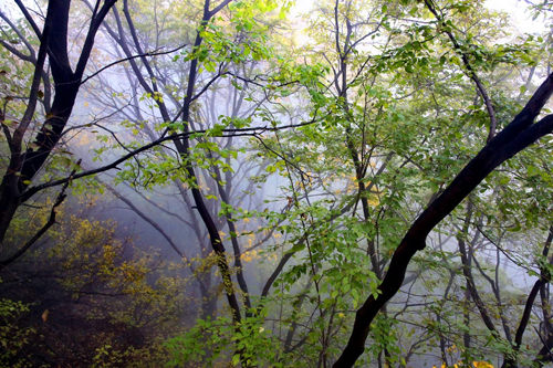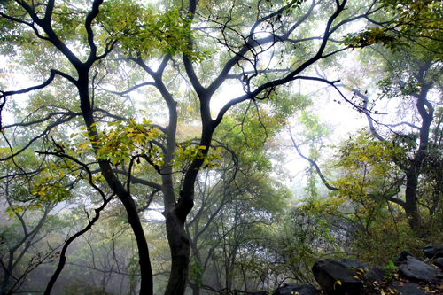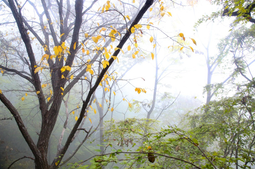 濃霧彤云不散 行攝喜憂參半 碧樹(shù)籠云煙 似春天