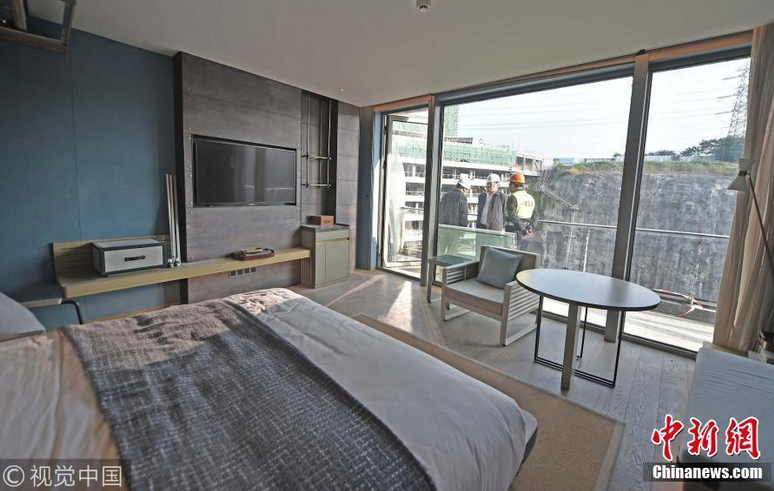 從空中俯瞰,被譽(yù)為世界建筑奇跡的深坑酒店,猶如瀑布懸掛在巨坑的峭壁上。由于要貼合圓弧形的巨坑,所有的房間都是C字形的。深坑酒店預(yù)計(jì)明年開業(yè),除336間客房外,還設(shè)有水下餐廳,以及步行景觀棧道、懸崖滑索、大擺錘等休閑娛樂項(xiàng)目。