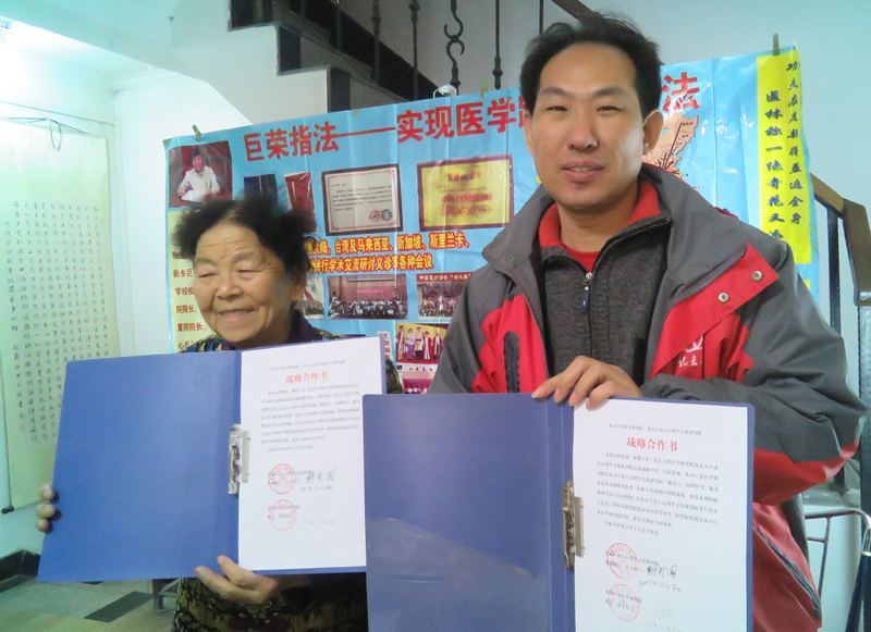 劉菊榮院長(左)為靳國靈頒發(fā)北京巨榮醫(yī)學研究院理療專家聘書